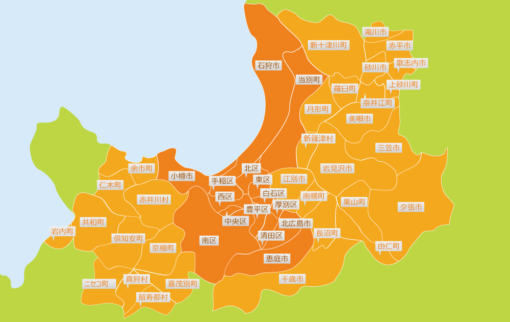 札幌市(北区、東区、手稲区、白石区、厚別区、豊平区、中央区、清田区、西区、南区)小樽市、石狩市、北広島市、恵庭市、当別町