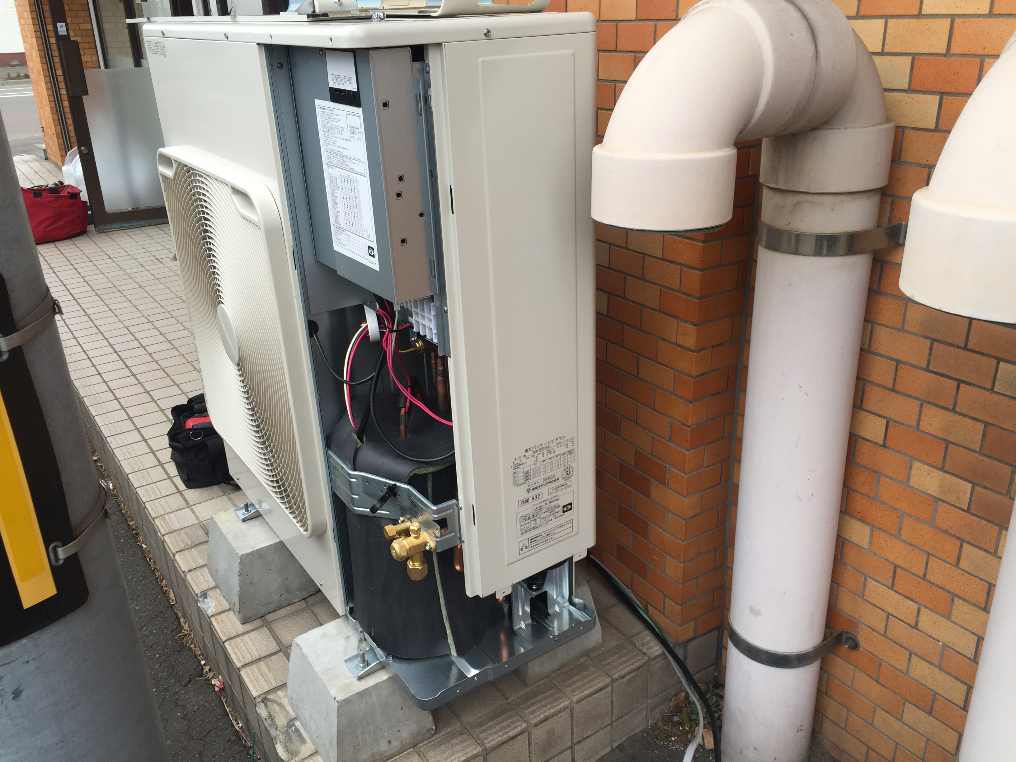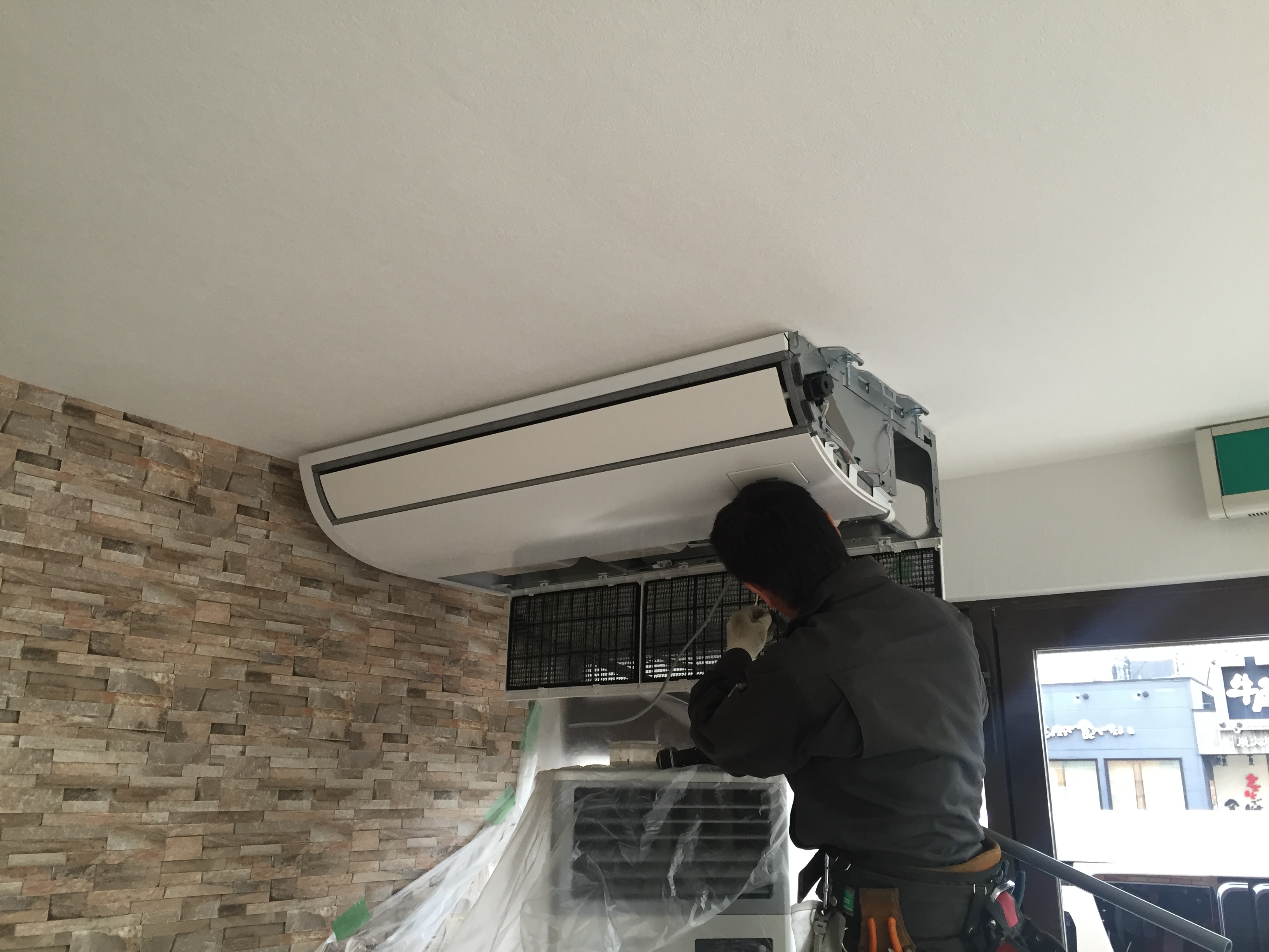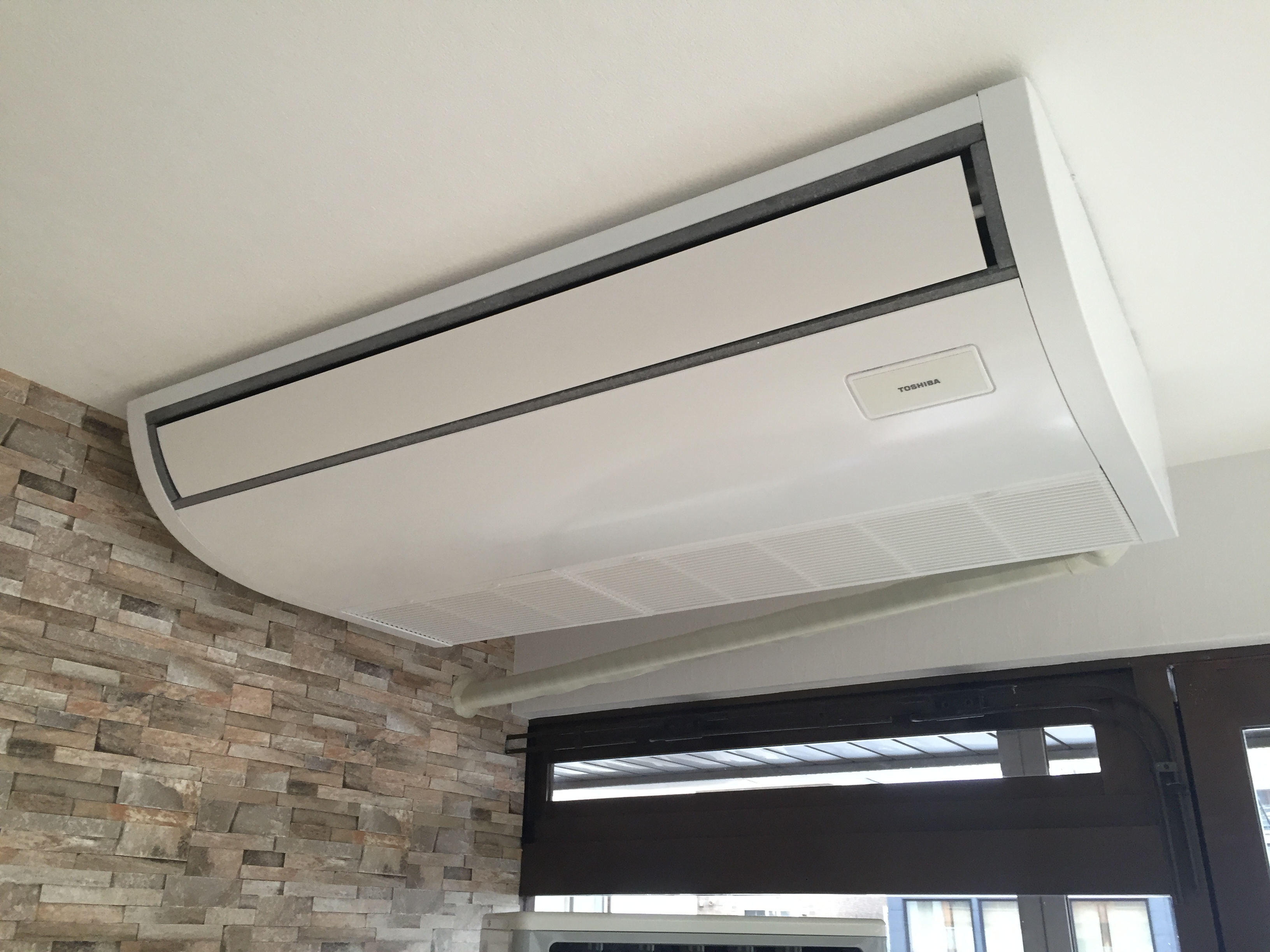 今回は単相200Vの3馬力タイプ、天吊り型の工事です。