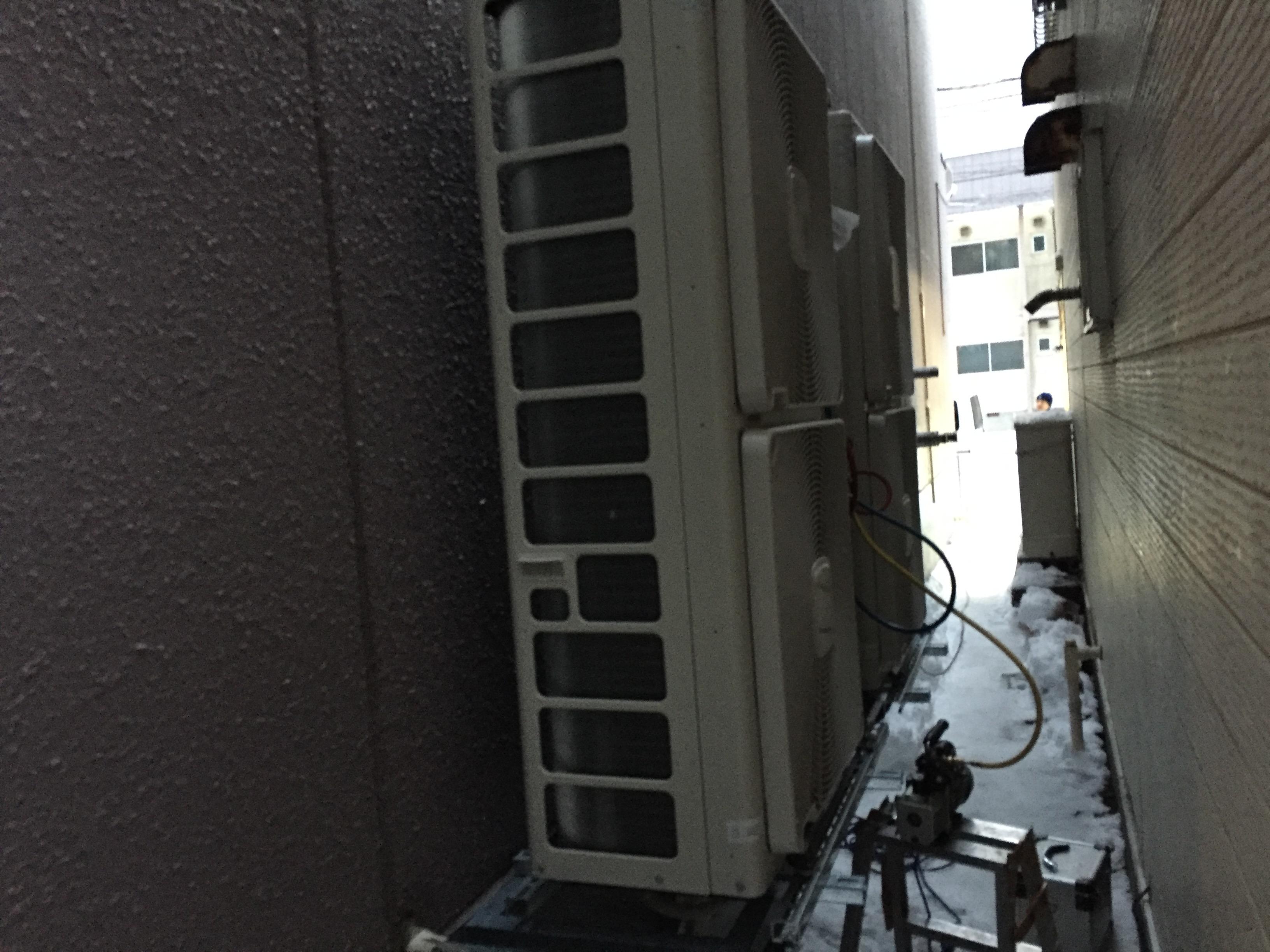 室外機は旧式の機械よりも大きい為に架台の加工をし、収めてます。