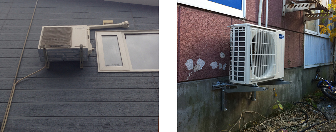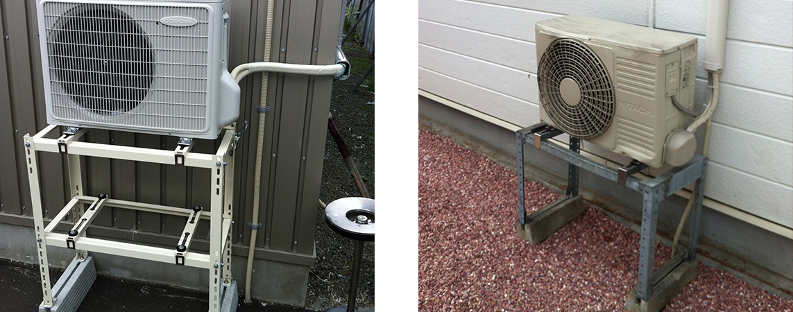 室外機を置き台ににて設置します。雪などで室外機が埋もれないようにするために架台に載せて設置します。※スライドブロックは2本で別途5000円(税別)掛かります。