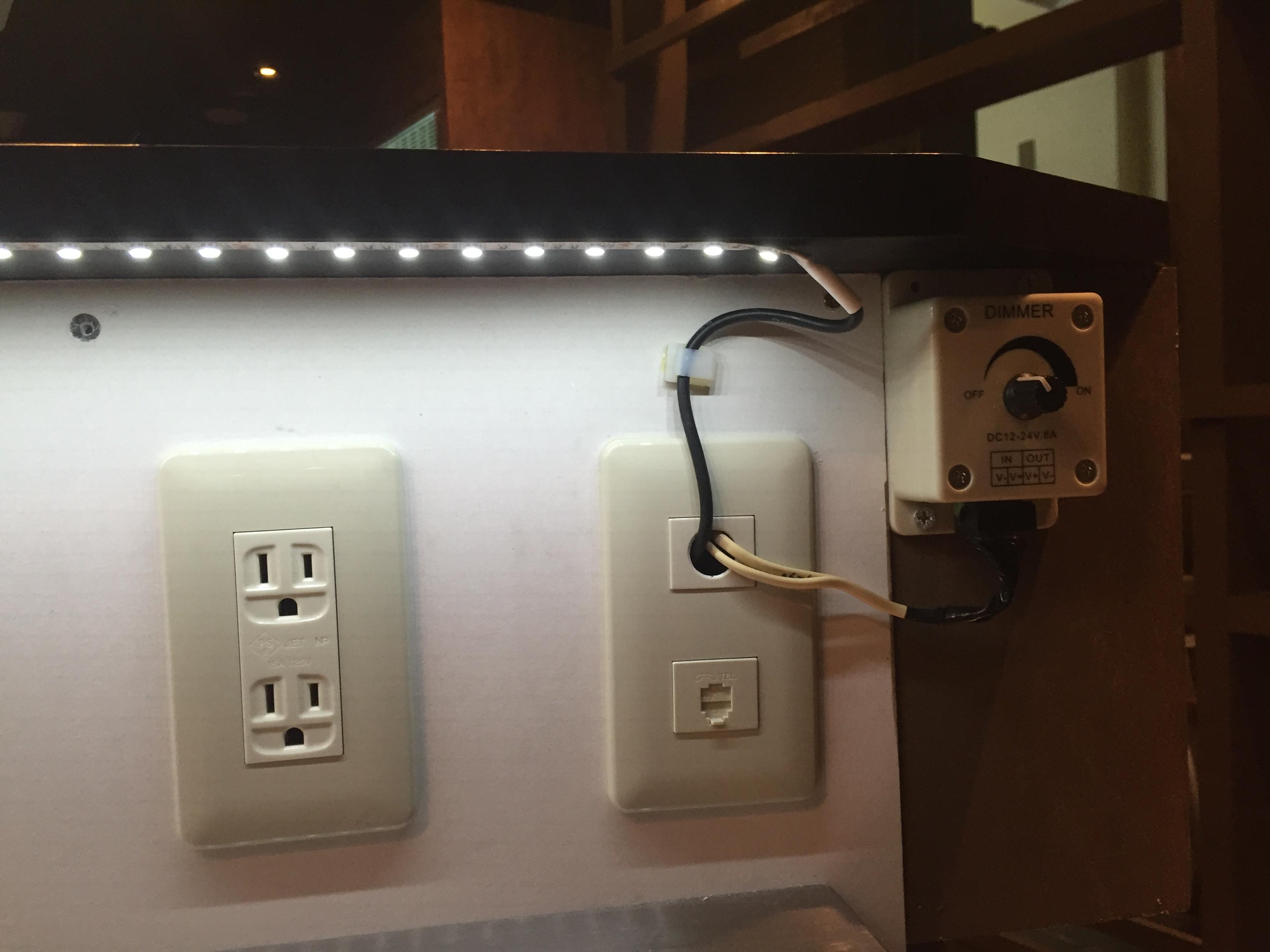 テープライトの調光コントローラーを取付けて手元で調光が出来るようにしてます。チップは5050タイプなので光量が強くコントローラーがあると便利です